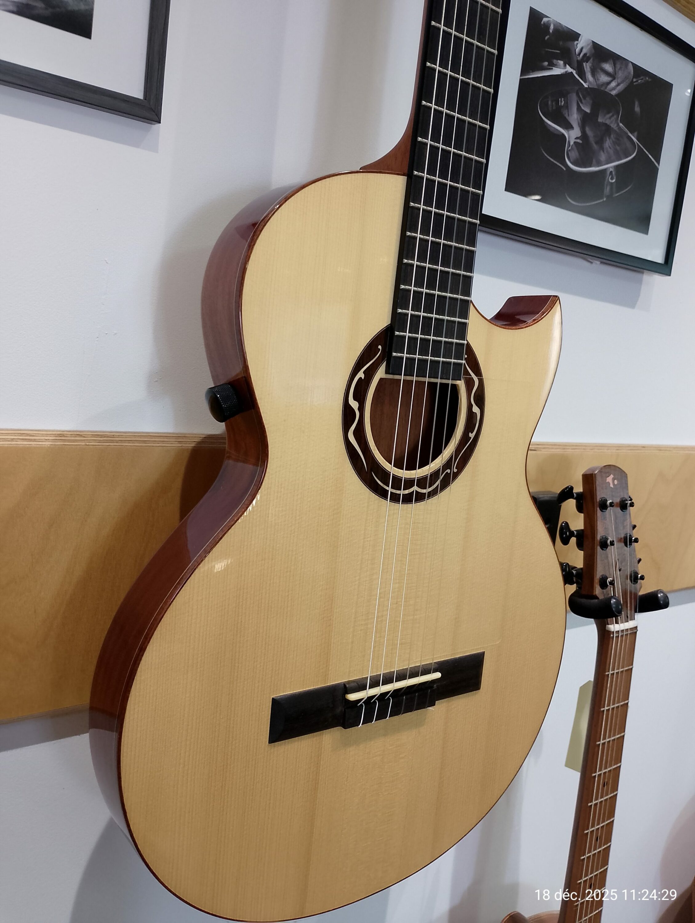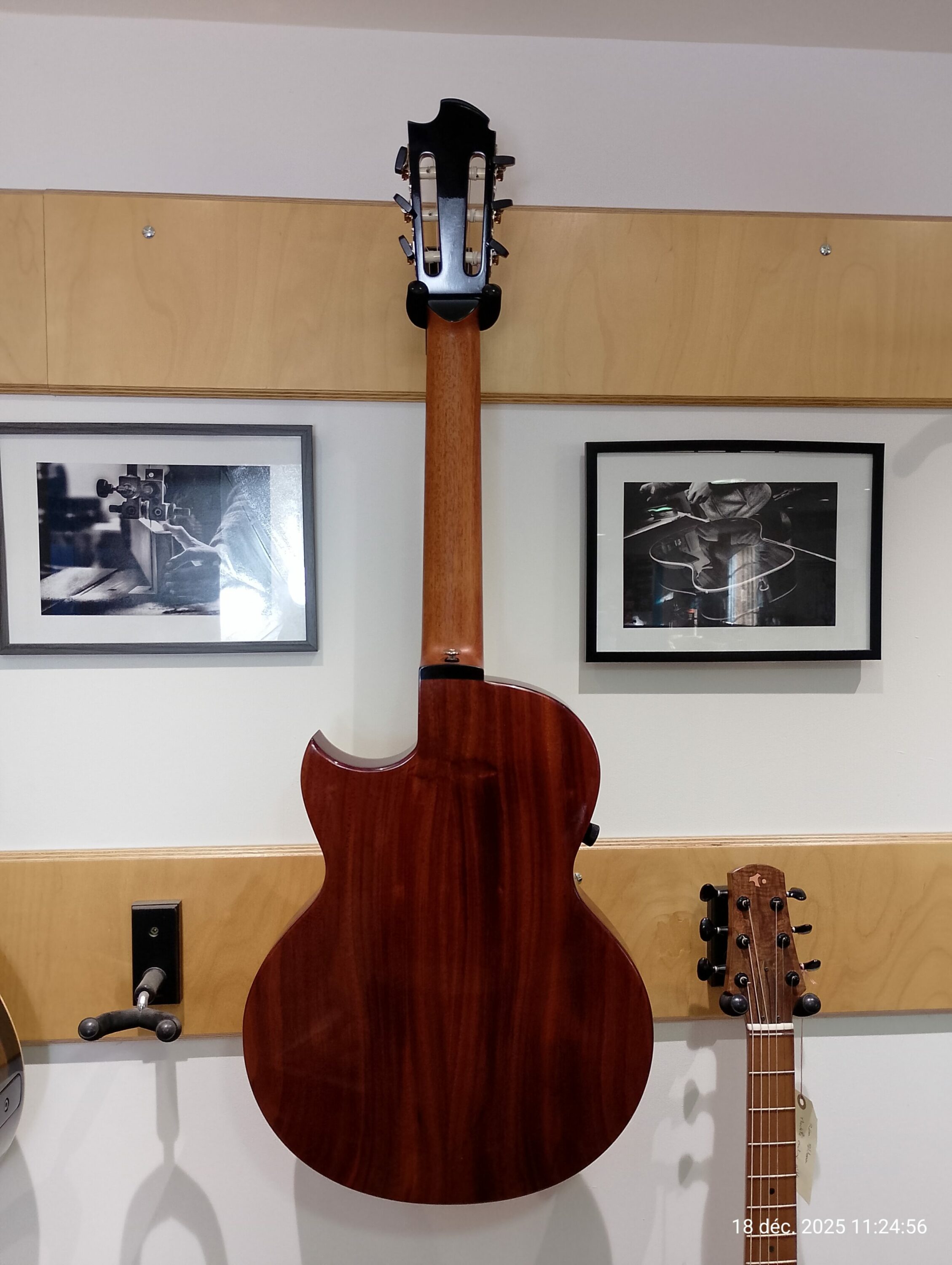 L’idée de départ étant d’en faire un instrument de scène (avec une capacité à supporter du gain et limiter les problèmes de larsen), la profondeur de la caisse a été réduite, les éclisses épaissies et la rosace au diamètre réduit est également tronquée.