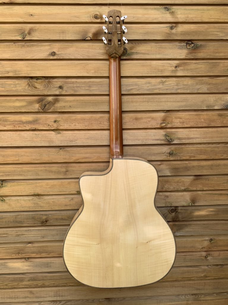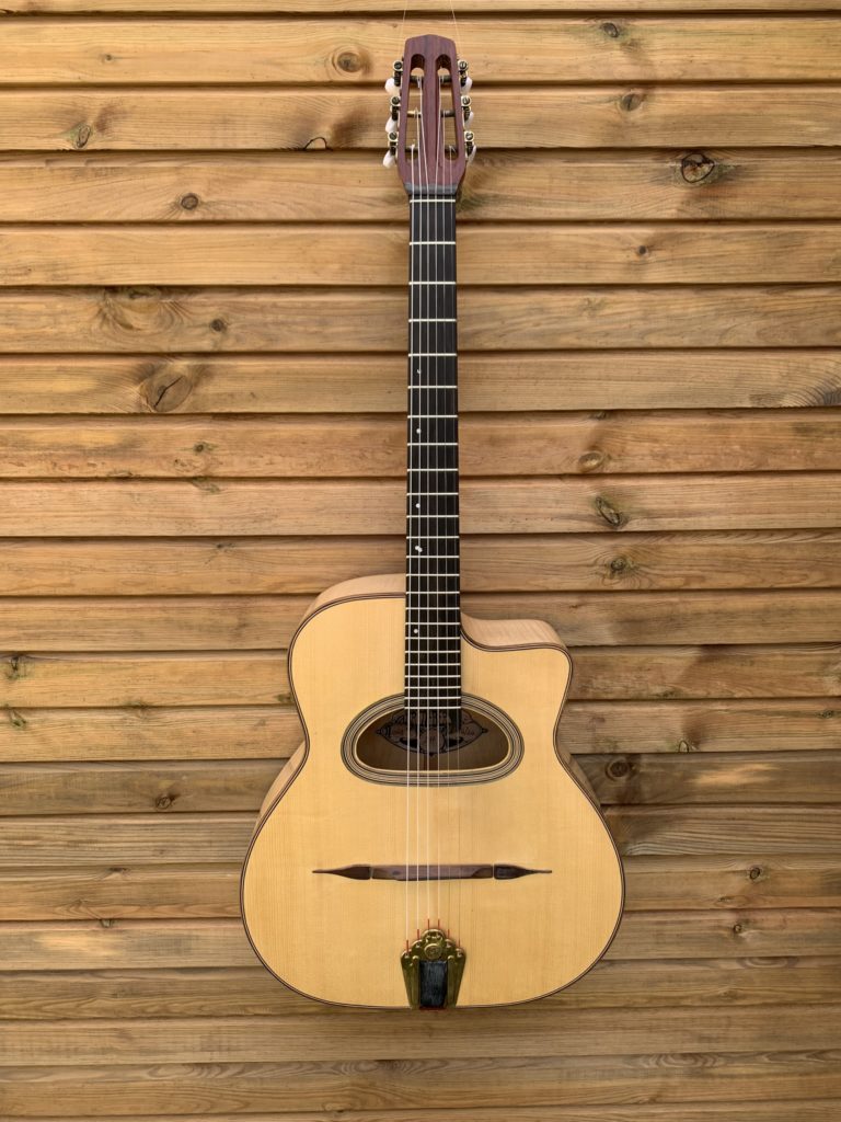 Vendu - commande possible Laurent Berger Modèle « DH » 2200€ Partage : Fiche technique 2020 État :Neuf Table : Epicéa Européen Corps :Erable Manche :Acajou/Noyer Touche :Ebène Filèterie :Noyer Chevalet :Palissandre Étui :oui